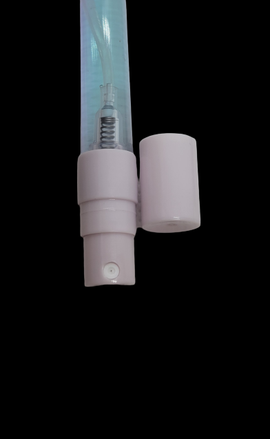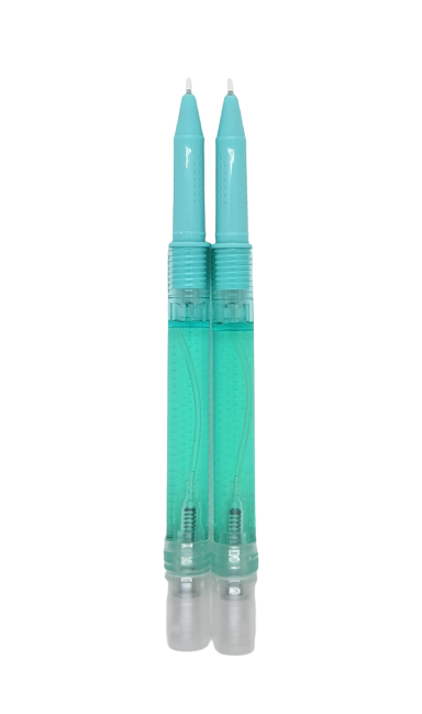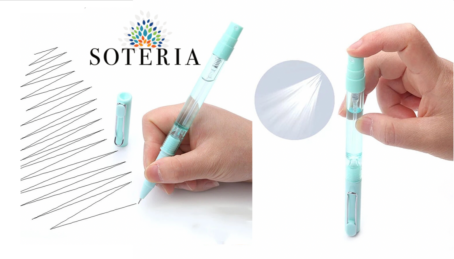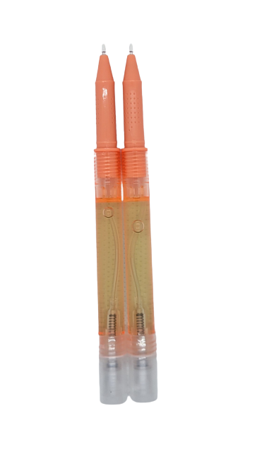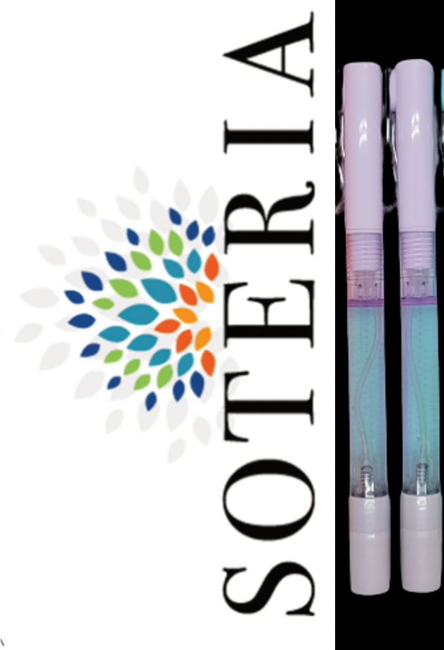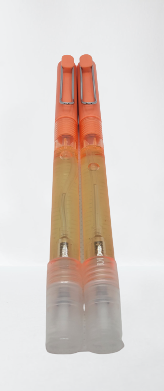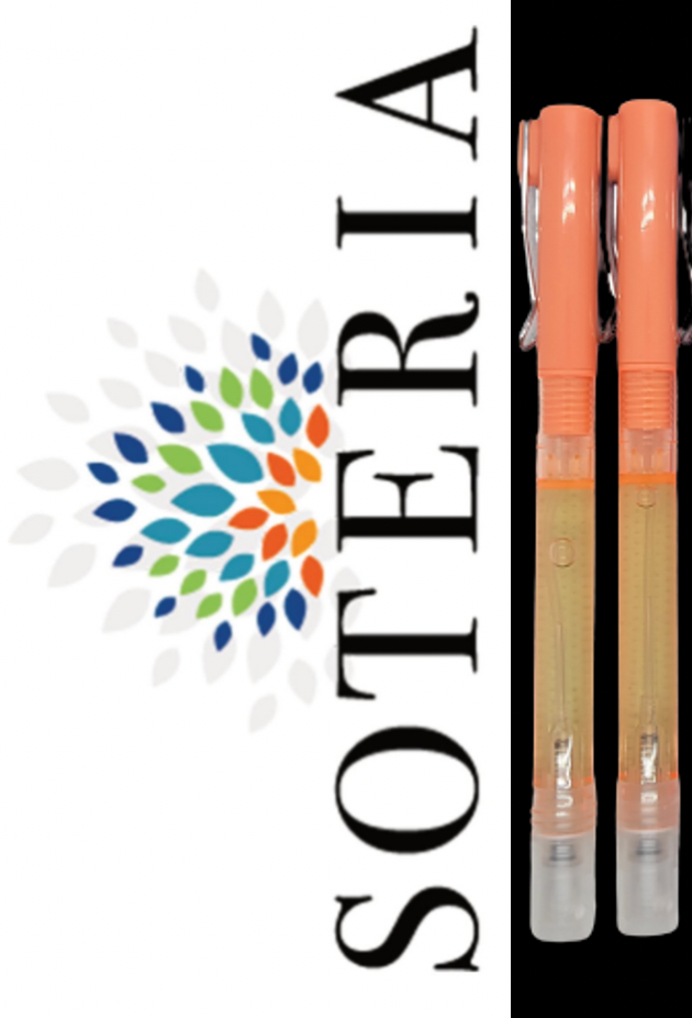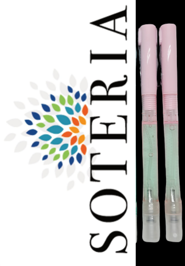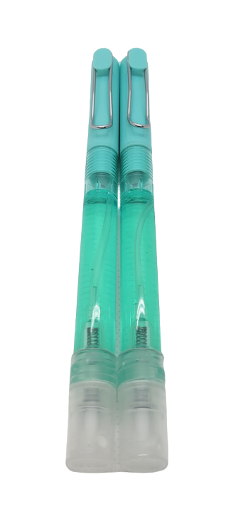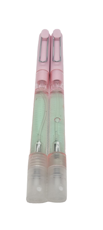 2. A pen with a Soteria hand sanitizer spraying container at the bottom. It emits a fine mist and avoids spillage and waste by evenly dispersing the liquid.